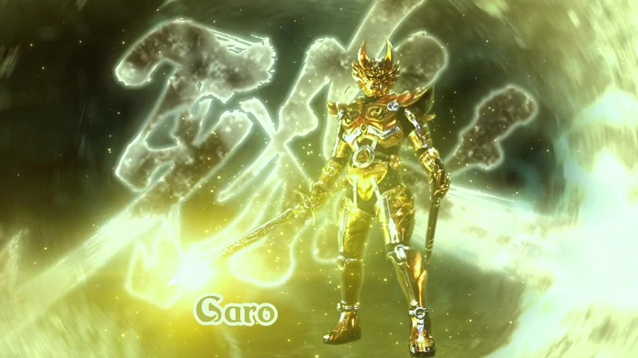Garo is the titular golden Makai Armor of the franchise. The armor specializes in long-sword combat. Whoever wields the armor shall take the title of Garo the Golden Knight (黄金騎士・牙狼,Ōgon Kishi Garo, "Fanged Wolf"). In the Ryūga-verse, the armor never belonged to the Saejima Clan. A former Golden Knight sacrificed his life and the armor made it to Ryūga Dōgai as its most recent successor. This armor first appears in The One Who Shines in the Darkness.